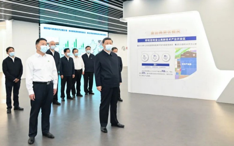 会后习近平来到中环产业园考察。在园区展厅,习近平听取当地发展新能源新材料产业、促进产业结构优化调整、推动绿色低碳发展等情况介绍。